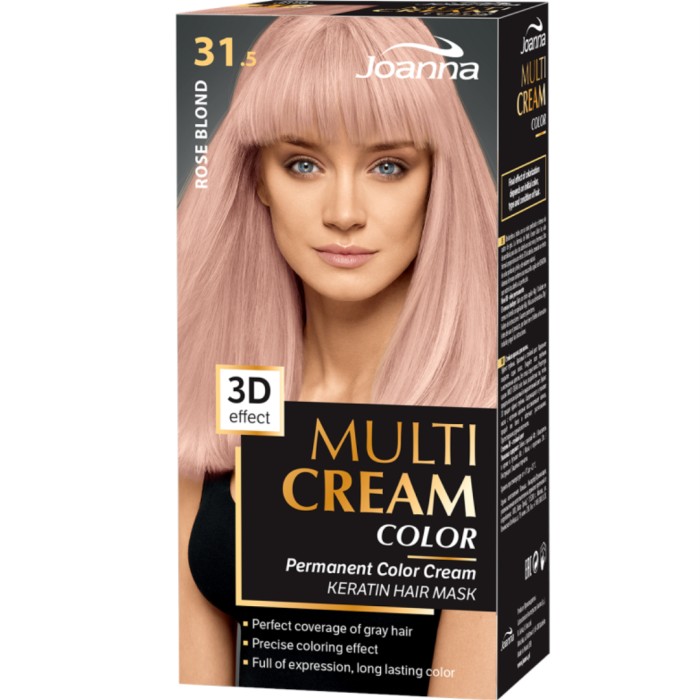 Joanna Multi Cream Color är en permanent hårfärg som täcker grått hår. 3D-effekt som ger ett intryck av djup. Ger naturlig volym och en vacker och fyllig färg. Med UV-filter som förhindrar färgblekning av solen. PPD-fri (dvs innehåller ej Para-phenylenediamin). En keratin-hårmask medföljer i förpackningen.