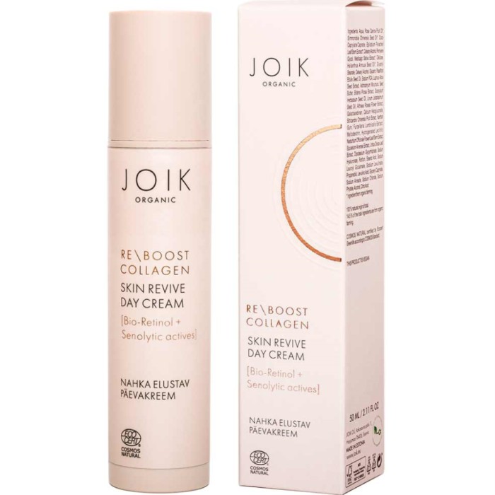 JOIK Organic Re-Boost Collagen Skin Revive Day Cream är en dagkräm för mogen hud. Dagkrämen innehåller bio-retinol från läkemalva, stamceller från stockros, fjällkåpa, lupinextrakt och alfalfaextrakt som stödjer kollagensyntesen, aktiverar hudens förnyelse, reducerar fina linjer och förbättrar hudens elasticitet, vilket gör huden fastare.