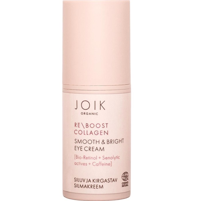 JOIK Organic Re-Boost Collagen Smooth & Bright Eye Cream är en uppfriskande ögonkräm som reducerar mörka ringar och jämnar ut fina linjer. JOIK ögonkräm innehåller läkemalva, stamceller från stockros, fjällkåpa, lupin, avokado och hästkastanjextrakt, koffein, squalane samt nyponolja främjar kollagensyntesen, jämnar ut linjer, förbättrar hudens elasticitet och reducerar mörka ringar och svullnad runt ögonen.