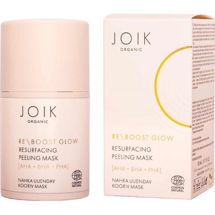 Re-Boost Glow AHA+BHA+PHA Resurfacing Peeling Mask från JOIK Organic är en exfolierande ansiktsmask som ger lyster åt huden och dämpar ålderstecken. JOIKs exfolierande ansiktsmask innehåller AHA-syror från bär, citrusfrukter, sockerrör och lönn. BHA-syror hämtas från pilbark, medan PHA-syror kommer från fermenterad kaktusfikon. Förutom syrorna innehåller ansiktsmasken lingonextrakt, humle och rosenvatten.