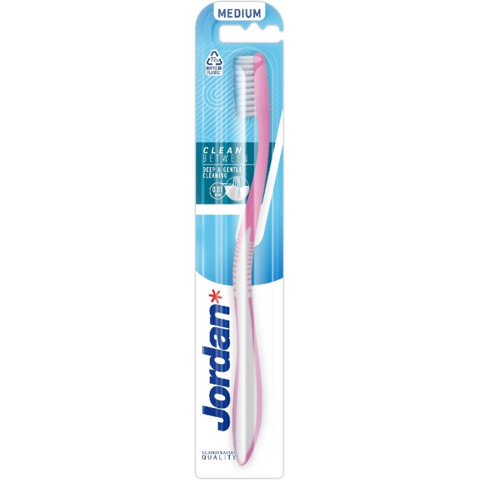 Jordan Clean Between Medium är en tandborste med koniska borststrån för bättre rengöring mellan tänderna samt mellan tänder och tandkött. De ultratunna borststråna med spetsiga toppar ger en djup rengöring mellan tänderna.