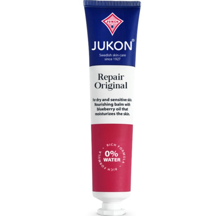 Jukon Repair Original är en klassisk skyddande, vattenfri salva ursprungligen framtagen redan år 1927. Jukon-salvan hjälper torr och narig hud att återhämta sig snabbt, och kan användas till torra händer, nagelband, armbågar och fötter. Kan även användas för skydd mot kyla och vind.