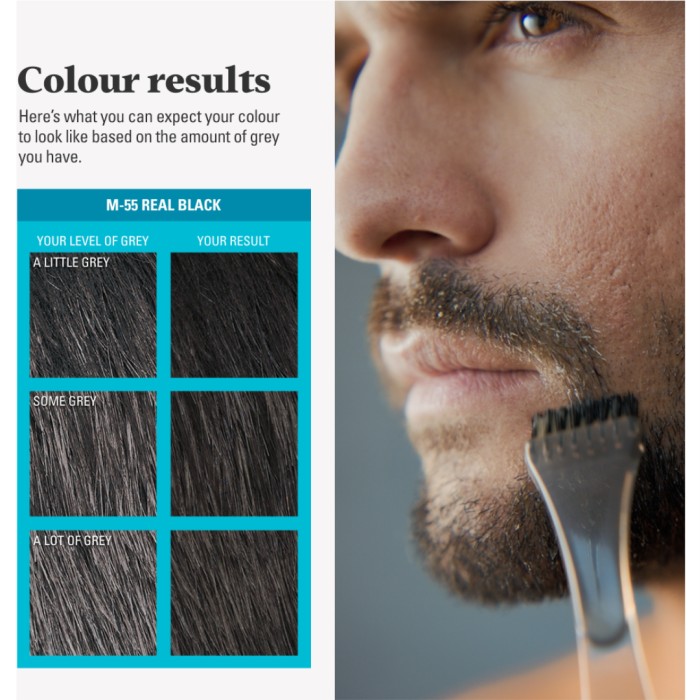 Just For Men Skäggfärg reducerar grått hår i skägg och mustasch, och gör att håret ser tjockare och fylligare ut. Skäggfärgen innehåller bl a biotin, aloe och kokosnötsolja. Skäggfärgen appliceras med den medföljande borsten och verkar på ca 5 minuter.