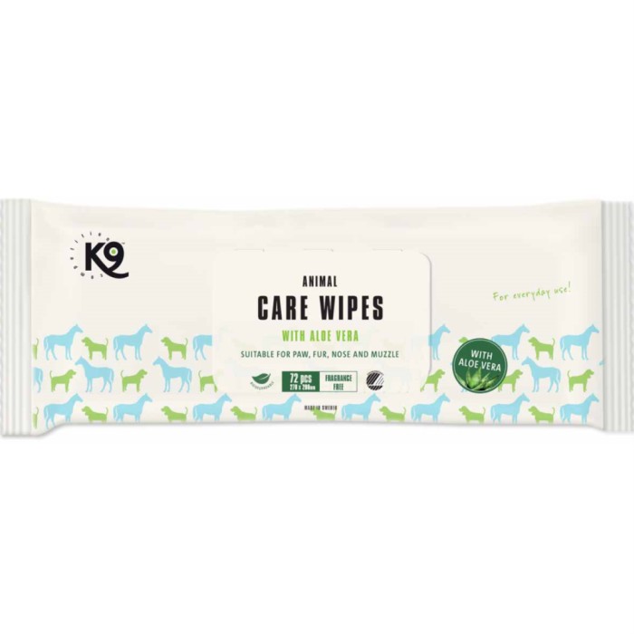 K9 Animal Care Wipes är våtservetter för djurvård. Innehåller Aloe vera som verkar mjukgörande för tassar, nos och mule och kan användas dagligen. Vätskan i våtservetterna är parfymfri och kan användas även vid känsliga områden och slemhinnor, t ex i djurets mungipor, öron, runt ögon eller mule. Svensktillverkade.