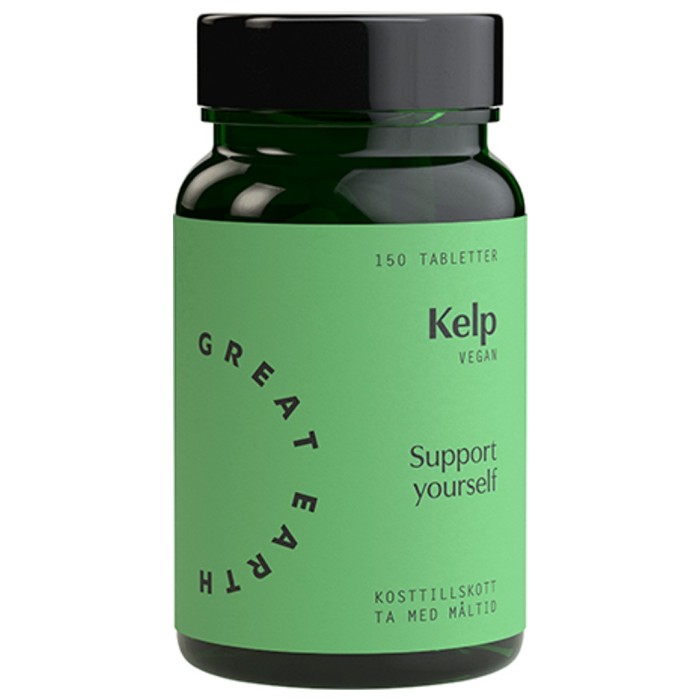 En tablett Great Earth Kelp innehåller 225 mkg jod från brunalgen kelp.
