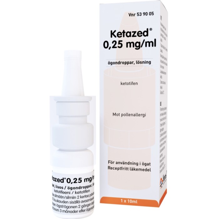 Ketazed är ett receptfritt läkemedel som används för att behandla ögonbesvär som orsakas av pollenallergi hos vuxna och barn över 3 år. Ketazed innehåller den aktiva substansen ketotifen som är en antiallergisk substans. Använd exakt enligt beskrivning i bipacksedel, eller enligt anvisningar från läkare, apotekspersonal eller sjuksköterska.