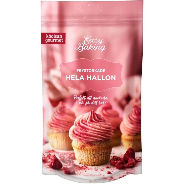 Khoisan Gourmets frystorkade hallon är 100% bär, noga utvalda för sin rika smak. Blåbären behåller sin form och textur i både varm och kall bakning och passar bra i muffins, smoothies och granola - och som till topping på olika bakverk och desserter. De går också bra att mala till pulver om du vill smaksätta en frosting att dekorera med.