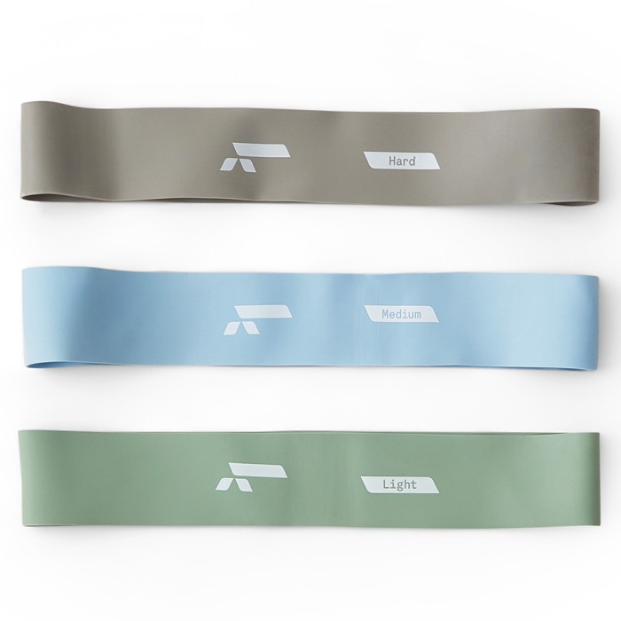 Kii miniband 3-pack innehåller ett set av bredare träningsband i varierande motstånd - Miniband Lätt, Miniband Medium och Miniband Hård.