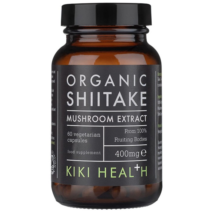 KIKI Health Organic Shiitake Extract Mushroom är ett kosttillskott med extrakt från fruktkropparna av svampar (inte från mycelium). Fruktkropparna odlas på träsubstrat (inte på spannmål) och innehåller betaglukan-rika polysackarider och andra ämnen.