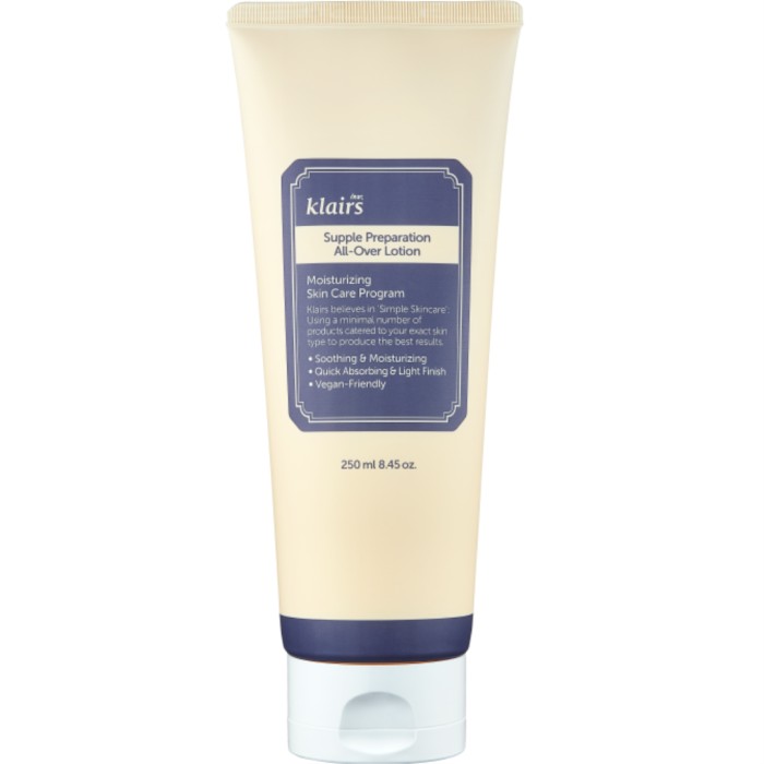Klairs Supple Preparation All-Over Lotion är en fuktkräm för alla hudtyper, som kan användas både till kroppen och ansiktet. Lotionen absorberas lätt av huden och ger en mjuk och smidig känsla. Supple Preparation Lotion innehåller mjukgörande jojoba och sheasmör, och fuktbindande hyaluronsyra. Lotionen är mycket mild och fungerar även för känslig hud.