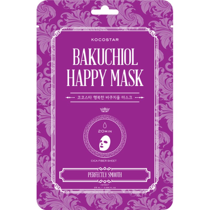 Kocostar Bakuchiol Happy Mask är en ansiktsmask i form av en sheet-mask som balanserar huden och främjar en jämnare hudton. Masken är berikad med bakuchiol, ett mildare och växtbaserat alternativ till retinol som har visat sig minska hyperpigmentering och rynkor, och som samtidigt förbättrar hudens struktur och elasticitet. Sheet-masken innehåller även en CICA-komplex som lugnar och reparerar huden samtidigt som den har antioxidativa egenskaper.
