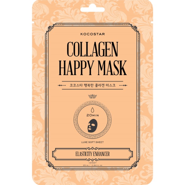 Kocostar Collagen Happy Mask är en ansiktsmask i form av ett ark som man lägger på huden. Arkmasken innehåller ett serum med ingredienser som ökar hudens naturliga produktion av kollagen och får huden att se mer smidig och ungdomlig ut.