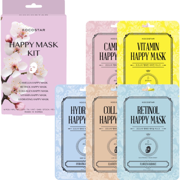 Kocostar Happy Mask Kit innehåller fem stycken KOCOSTAR Happy Mask sheet masks – perfekta för dagar då du vill ha en avkopplande hemmaspa-stund.