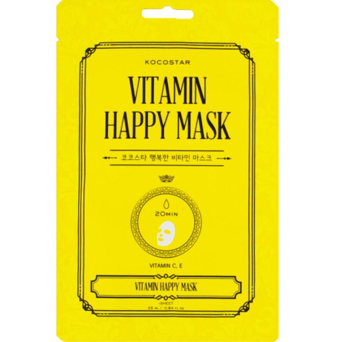 Kocostar Vitamin Happy Mask är en fuktgivande ansiktsmask berikad med vitamin C och E som skyddar huden med antioxidanter. Sheetmasken innehåller hyaluronsyra och niacinamid för att lugna huden och ge lyster. Det mjuka arket är tillverkat av 80 % lyocell och 20 % lotusfibrer så att det ska fästa bra mot huden.