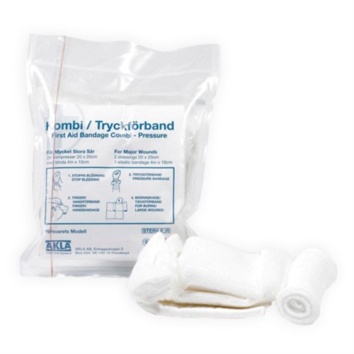 AKLA Kombi/Tryckförband för mycket stora sår. Sterilt förpackat i specialpåse av tålig tjock polyeten med rivtråd enligt försvarets modell för att klara tuffa krav. Innehåller 2 kompresser 20x20cm och 1 binda 4m x 10cm.