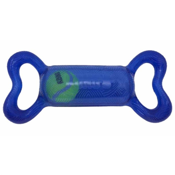 KONG Jumbler Tug Bone har en rullande inre tennisboll och höga pipande ljud och kan användas för drag- och hämtningslek. Hundleksaken är gjord för att hålla för tuff lek. Den har två handtag som gör det enkelt att dra och skaka i interaktiv lek.