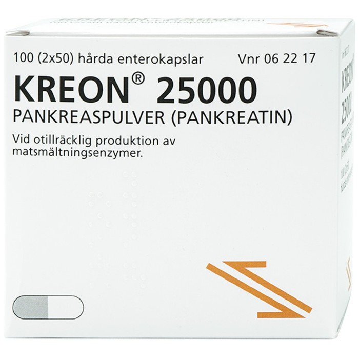 Kreon hårda enterokapslar är ett receptfritt läkemedel vid otillräcklig produktion av matsmältningsenzymer. Används vid behandling av exokrin pankreasinsufficiens med malabsorption hos barn och vuxna, ofta associerad med, men inte begränsad till:
