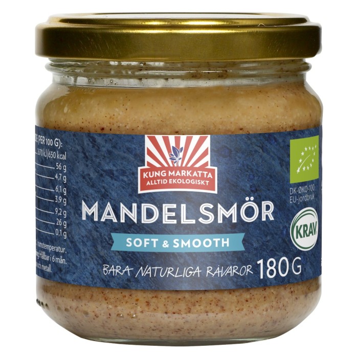 Kung Markattas Mandelsmör är ett nötsmör gjort på ekologiska sötmandlar. Mandlarna har rostats lätt innan de gjorts till ett smör som har en rund och god smak. Passar i efterrätter, smoothies eller att äta på en sked direkt ur burken.