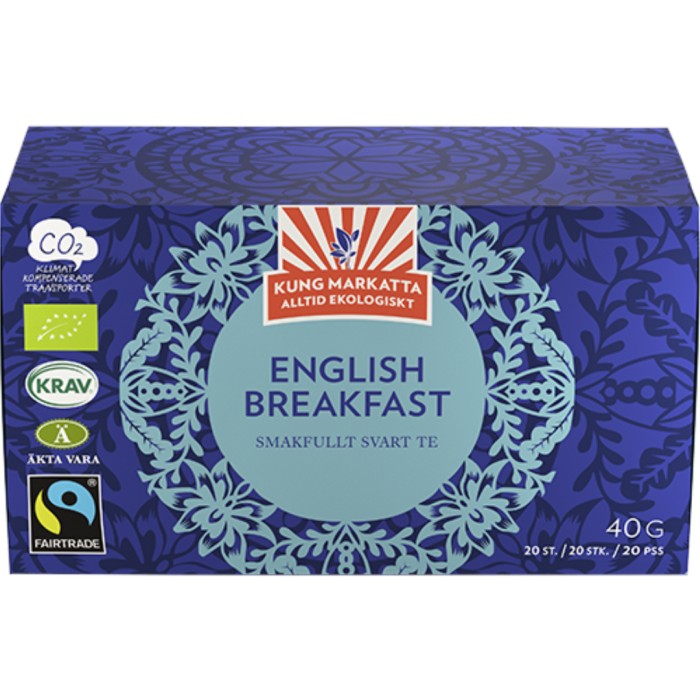 Kung Markatta English Breakfast är en klassisk teblandning av småbladiga svarta tesorter som ger en kraftig smak, ett te som är perfekt att dricka med en liten skvätt mjölk. Eftersom svart te innehåller koffein (eller tein) - ungefär hälften så mycket som kaffe - kan det passa bra att ta en kopp svart te när man vill vakna till.
