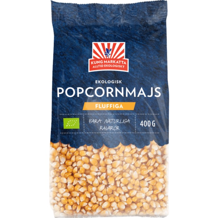 Kung Markattas ekologiska popcorn är ett gott alternativt när du är sugen på en snack. Du poppar dem själv i en kastrull på spisen. Om du vill ge dina hemmapoppade popcorn en lite egen smak, prova att poppa dem i kokosolja eller Kung Markattas ekologiska Ghee - både tål hög värme.