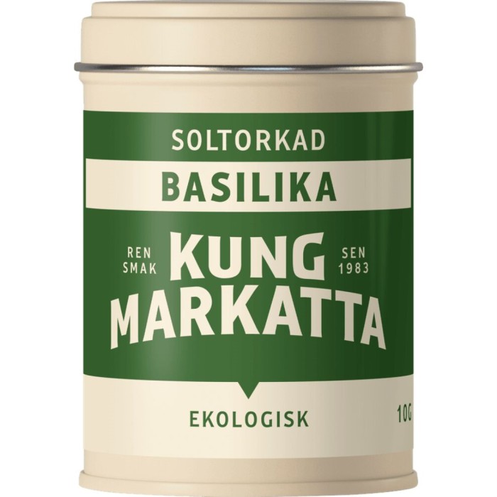 Kung Markatta Basilika är ekologisk soltorkad basilika som är skonsamt behandlad för att behålla bästa möjliga smak och doft.