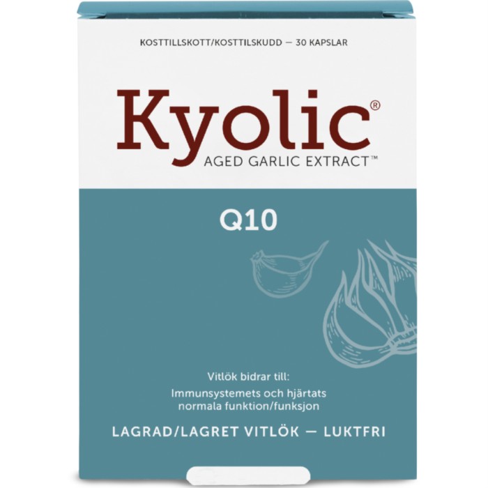 Kyolic Aged Garlic Extract™ (AGE) + Q10 är ett kosttillskott med ett luktfritt, kallextraherat vitlöksextrakt som lagrats i upp till 20 månader på stålfat. Vitlöksextraktet är gjort på ekologiskt odlad vitlök. Kapseln innehåller även 100 mg av coenzym Q10 som är ett naturligt förekommande ämne i kroppens cellsystem. Kyolic Aged Garlic Extract är skonsam för magen.