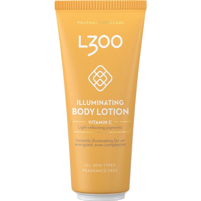 L300 Illuminating bodylotion innehåller vitamin C som är en kraftfull antioxidant som återfinns naturligt i hudens alla lager. Lotionen innehåller ljusreflekterande pigment som ger huden en fräsch lyster direkt. Resultatet blir en återfuktad hud med jämnare hudton och fint skimrande finish. Dermatologiskt testad. Oparfymerad. Innehåller ej ingredienser av animaliskt ursprung.