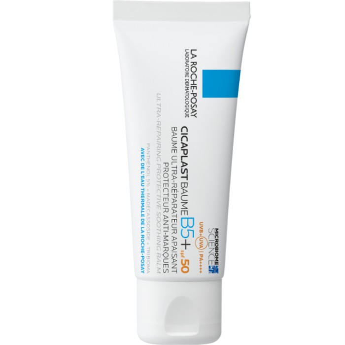 Cicaplast Balm B5+ SPF50 från La Roche-Posay är en lugnande, återuppbyggande och skyddande balm med solskyddsfaktor 50 för alla typer av känslig och irriterad hud. Balmen hjälper till att minska synligheten av ärr och är särskilt lämplig efter dermatologiska behandlingar (som laser och peeling) eller som vårdande efterbehandling av tatueringar. En kräm för vuxna och barn från 3 år. Kan användas på kroppen, i ansiktet och på läpparna. Utan parfym.