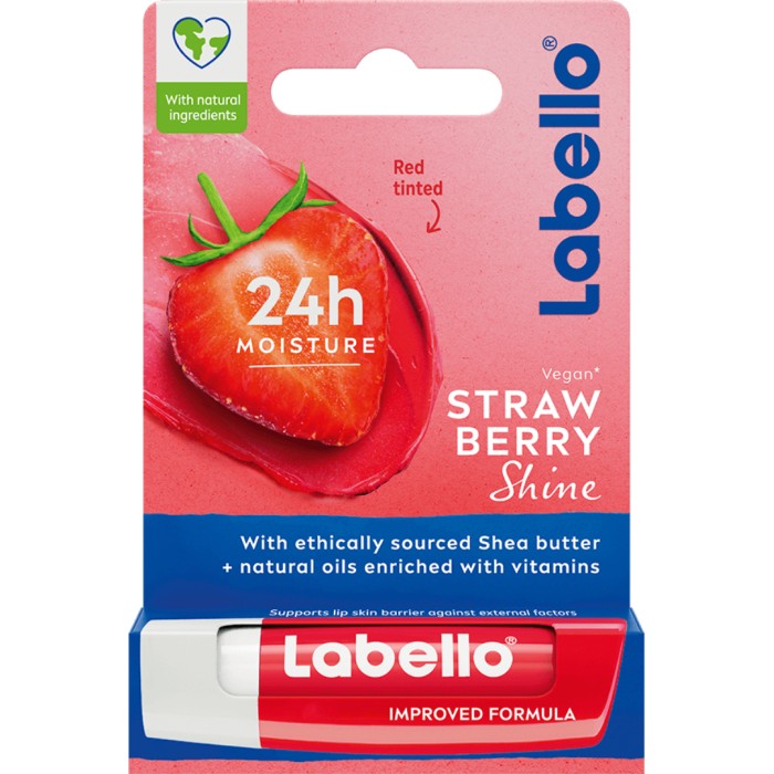 Labello Strawberry Shine Lip Balm är ett läppbalsam som återfuktar läpparna och ger en hint av färg. Labello Strawberry Shine läppcerat har en doft av jordgubbsarom och ger dina läppar en subtil röd glans. Hjälper till att hålla läpparna återfuktade i upp till 24 timmar och skyddar mot kyla, vind och torr luft. Kliniskt testad. Den nya förbättrade formuleringen är berikad med naturliga ingredienser och innehåller sheasmör, oljor och vitaminer. Formuleringen har en behaglig konsistens som omedelbart smälter in på läpparna och håller dem återfuktade. Ceratet stöttar läpparnas hudbarriär mot yttre faktorer samt skyddar dem från att torka ut. Vegansk formulering, utan animaliska ingredienser. Dermatologiskt testad.