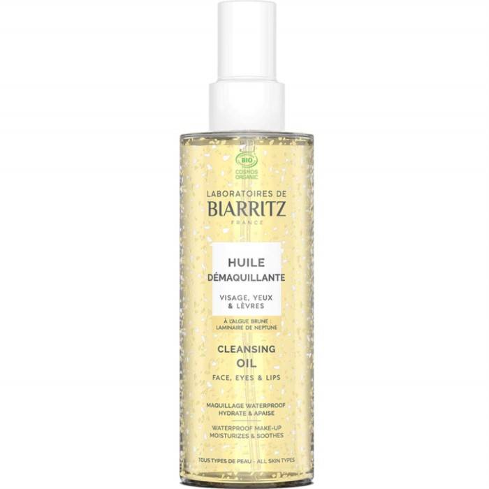 Laboratoires de Biarritz Cleansing Care Cleansing Oil Face, Eyes & Lips är en återfuktande och lugnande rengöringsolja som tar bort orenheter och överflödig talg och smink (även vattenfast smink). Rengöringen innehåller Laminaria saccharina, som extraheras ur havsalger och lugnar huden och gör huden klarare. Rengöringsoljan innehåller ekologisk solrosolja och bisabolol som återfuktar och mjukar upp huden.
