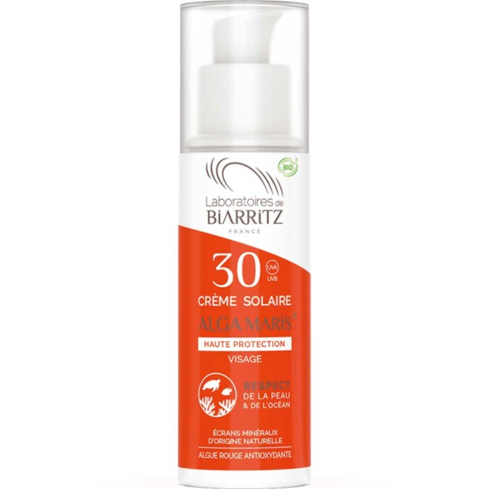 Alga Maris Face Sunscreen SPF30 från Laboratoires de Biarritz är en solkräm för ansiktet. Laboratoires de Biarritz Face Sunscreen med SPF 30 passar den med en aktiv livsstil. Den vatten- och svettresistenta solkrämen för ansiktet ger en skydd som passar vid olika typer av aktiviteter utomhus, även vattensporter. Solkrämen har en lätt konsistens som sitter bra utan att rinna ner eller irritera ögonen. Ger ett skydd mot UVA/UVB och fria radikaler. Solkrämen innehåller ett patenterat extrakt från röda havsalger med kraftfull anti-age-effekt. Ger intensiv återfuktning och gör huden mjuk. Lämnar inte vita märken. Luftfri pumpflaska.