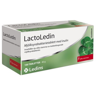 LactoLedin är ett kosttillskott som innehåller hela sju stammar av olika mjölksyrabakterier. Dessa bakterier är dubbeldragerade vilket innebär att bakterierna överlever passagen förbi den sura miljön i magsäcken. Bakterierna passerar ner till tunntarmen, där löses det skyddande lagret upp och den levande bakterien kan börja verka gynnsamt. Bakterierna är täckta med två skyddande lager som består av proteiner och polysackarider. LactoLedin innehåller även inulin (från cikoriarot) som är ett prebiotika. Inulin fungerar som föda åt de goda bakterierna. med hjälp av inulinet får bakterierna näring och kan på så sätt bibehålla den goda bakteriebalansen i tarmen. LactoLedin innehåller D-vitamin som stärker immunförsvaret.