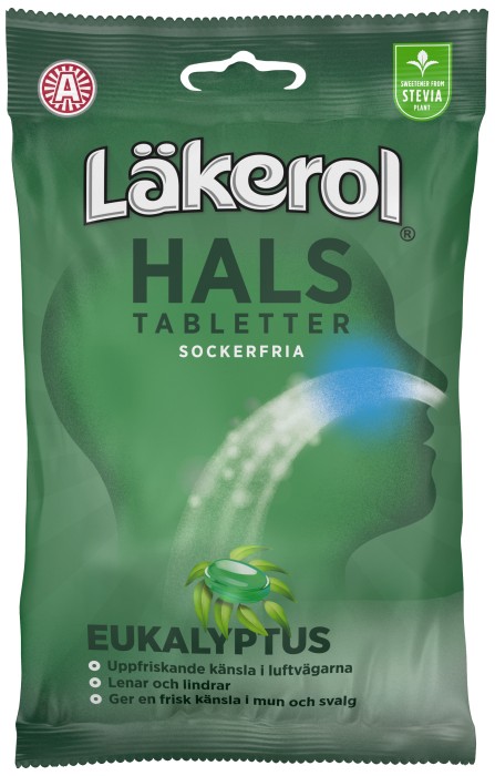 Läkerol Hals Eucalyptus är en sockerfri halstablett med essentiella oljor som utvinns ur eukalyptusblad. Oljorna har en lenande effekt för halsen och tillsammans med mentol ger tabletten en uppfriskande känsla i näsa och mun.