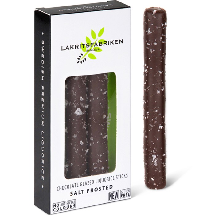 Lakritsfabriken Liquorice Sticks Dark Chocolate & Sea Salt innehåller 3 st mjuka saltlakritsstänger, doppade i mörk choklad och toppade med havssalt.
