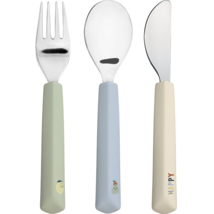Happy Fruits gaffel, sked och träningskniv (utan skärfunktion) är säkra för barn att hantera. Besticken är tillverkade av rostfritt stål med mjuka och ergonomiska silikonhandtag. De BPA-fria materialen och de rundade kanterna gör setet extra säkert för barn från 12 månader och uppåt. De greppvänliga handtagen i silikon hjälper barnen att hålla besticken stadigt, vilket gör måltiderna både enklare och roligare. Använd dem hemma eller ta med när ni är på språng.