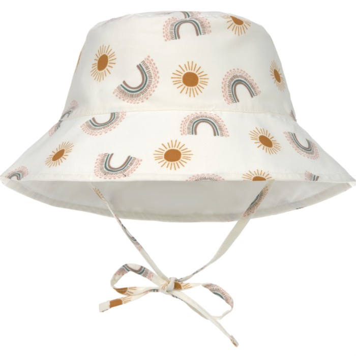 Lässig UV-hatt Regnbåge är en vändbar "bucket hat" tillverkad av återvunnen polyester, perfekt för sommardagar. Hatten ger ett UV-skydd 80 och skyddar känslig hårbotten hos spädbarn och småbarn. Hatten kan knytas under barnets haka så att den inte blåser bort eller trillar av vid lek. Materialet är lätt, andningsbart och snabbtorkande vilket gör den bekväm att bära både på land och i vatten. Solhatten kan tvättas i 30°C med skonsamt tvättprogram.