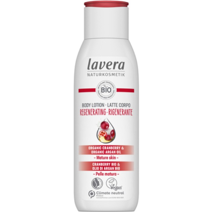 Lavera Regenerating Body Lotion är en rik bodylotion som gör huden mjuk och len. Kroppslotionen innehåller bland annat ekologiskt tranbärsextrakt och arganolja, som ger effektiv återfuktning till torr hud. Med en näringsrik formulering med vårdande oljor och tranbär som stöttar huden och motverkar dom första tecknen på åldrande hud. Arganolja lugnar och återfuktar även mycket krävande hud.