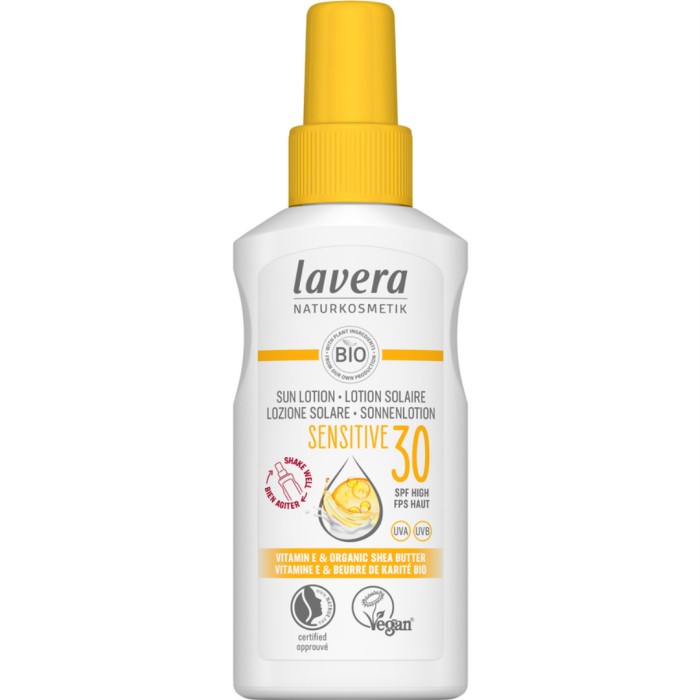 Lavera Sun Lotion Sensitive SPF 30 är en solkräm med 100% mineralbaserat solskydd. Solkrämen innehåller bland annat zinkdioxid, E-vitamin och ekologiskt sheasmör som skyddar huden omedelbart efter applicering. Med sin lätta och vattenavvisande formulering passar solkrämen alla hudtyper.