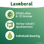 Det aktiva ämnet i Laxoberal, natriumpikosulfat, ombildas i tjocktarmen till verksam substans som sätter igång tjocktarmens rörelser så att tarminnehållet transporteras snabbare.