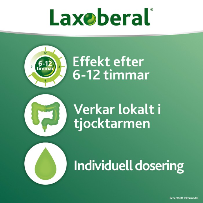 Dosen bör anpassas individuellt så att avföringen blir lagom mjuk. Hos vuxna börjar man lämpligen med 10 droppar på kvällen. Annan dos enligt läkares föreskrift. Maximal dygnsdos är 20 droppar. Laxoberal kan blandas med mat eller dryck. Användes högst en vecka. Därefter eventuellt medicinering varannan dag. Efter ytterligare en vecka kan medicinering var tredje dag prövas, och efter ytterligare en vecka ska behandlingen avslutas. 10 droppar Laxoberal motsvarar 5 mg natriumpikosulfat. Dropparna bör tas på kvällen för tarmtömning följande morgon. När Laxoberal givit avföring, så har tjocktarmen tömts helt. Det kan därför ta några dagar innan avföringsbehov uppstår på nytt. Använd inte Laxoberal om du har svåra magsmärtor, hinder i tarmen, inflammatorisk tarmsjukdom eller svår magsmärta med illamående och kräkningar.