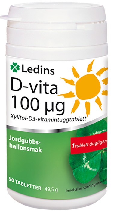 Ledins D-vita 100 µg är en D-vitamin sötad med xylitol. Finns i olika styrkor för vuxna. När man väljer dos är det viktigt att ta hänsyn till hur mycket D-vitamin man får genom kosten, hur mycket solljus man får, ålder, hudens färg, fetthalt i kroppen och skelettets kondition. Ledins D-vita är fri från laktos, gluten och jäst.