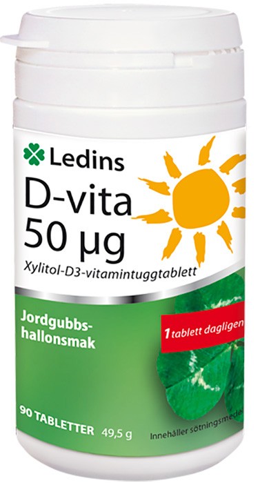 Ledins D-vita 50 µg är en D-vitamin sötad med xylitol. D-vita är ett kosttillskott för vuxna och finns i olika styrkor. När man väljer dos är det viktigt att ta hänsyn till hur mycket D-vitamin man får genom kosten, hur mycket solljus man får, ålder, hudens färg, fetthalt i kroppen och skelettets kondition.