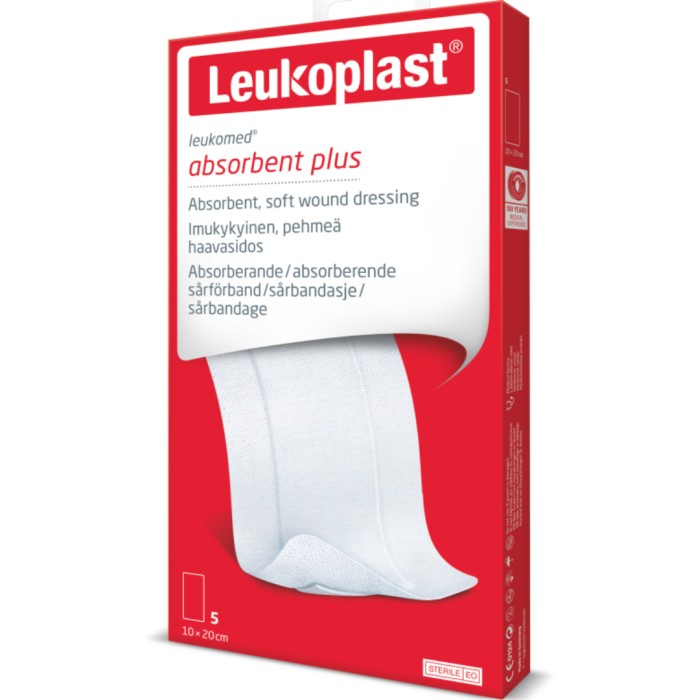 Leukomed Absorbent Plus är ett sterilt absorberande snabbförband i non-woven för skärsår, skrubbsår och andra mindre sår. Leukomed sårförband fastnar inte i såret och har rundade hörn för att inte lossna. Det är genomsläppligt för luft vilket motverkar huduppluckring och främjar en ostörd sårläkning. Leukomed ger en tillförlitlig vidhäftning med en effektiv men skonsam häfta och efterlämnar inga rester efter borttagning. Den absorberande sårdynan stänger in sårvätska och håller såret rent. Fastnar inte i såret eller suturen. Leukomed sårförband ger en steril barriär som ger ett skydd mot extern kontaminering och minskar risken för postoperativa infektioner. Använd tillsammans med Leukoplast Leukosan Strip vid skärsår.
