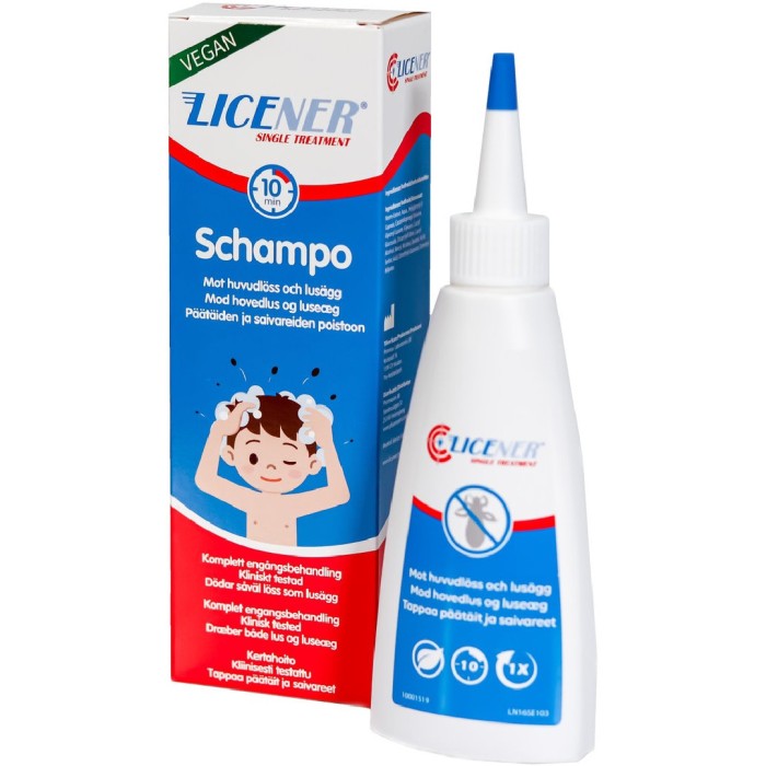 Licener Lusschampo är ett skonsamt schampo som dödar både löss och lusägg. Licener är en engångsbehandling som är lätt att använda, har effekt efter 10 minuter och avlägsnar både löss och lusägg i alla stadier. Den aktiva huvudingrediensen i Licener är neem-extrakt som är testad och effektiv. Schampot är lätt att tvätta ur och gör inte att man blir klibbig eller oljig i håret.