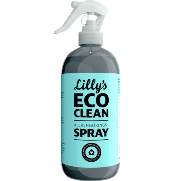Lilly's allrengöringsspray passar för alla hårda ytor, även granit och rostfritt stål (spraya dock ej direkt på vaxade ytor). Kakel, kranar, speglar och andra glasytor blir skinande rena och glansiga. Spraya först och torka sedan rent med en torr trasa. Låt sprayen dra en kort stund om smutsen är hårt intorkad, torka sedan rent. Förvaras oåtkomligt för barn.
