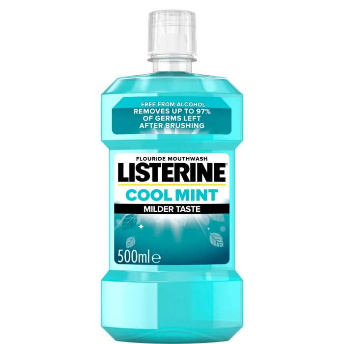 Listerine Cool Mint Milder Taste är en munskölj som kan användas för en ren och fräsch känsla i munnen. Listerine Cool Mint innehåller fluor och rengör, reducerar bakterier och plack i hela munnen och ger en fräsch andedräkt. Innehållet av fluor bidrar till att skydda mot hål i tänderna. Alkoholfri med en mild smak.