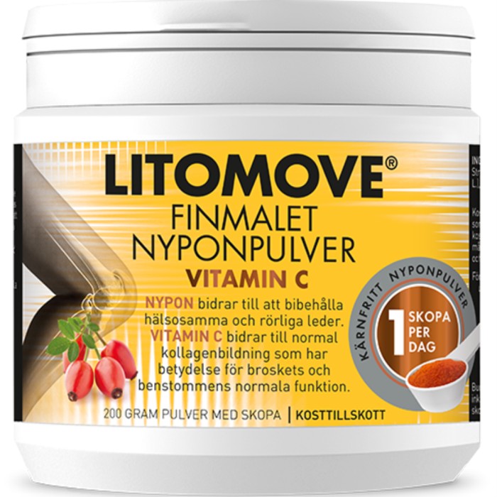 Litomove Nyponpulver med vitamin C är ett kosttillskott med kärnfritt nyponpulver. Litomoves nyponpulver innehåller nu även vitamin C som bidrar till normal kollagenbildning, vilket har betydelse för broskets och benstommens normala funktion.