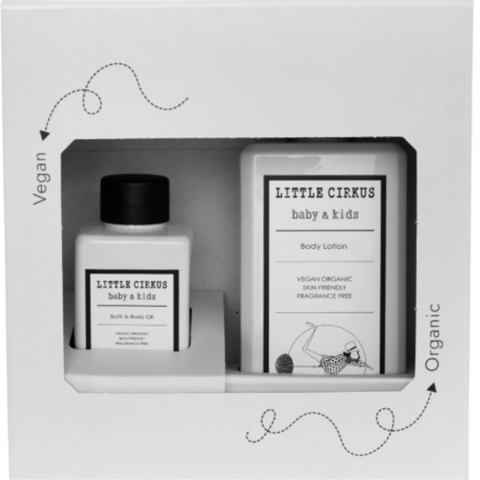 Little Cirkus Hydration Kit är en box som innehåller en hudlotion och babyolja för barnets hud.