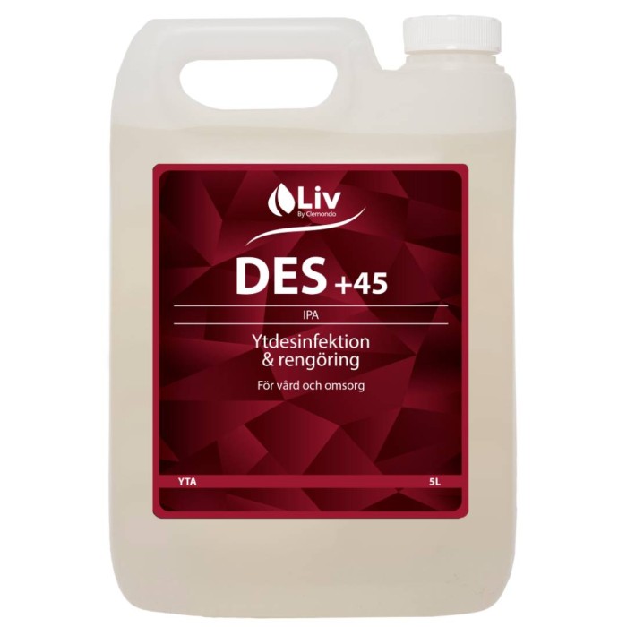 Liv DES +45 innehåller ca 45 volymprocent isopropylalkohol (ipa) med en tillsats av tensid för att få en rengörande effekt på lätt smutsade ytor. pH-värde 8. Tillverkad i Sverige.