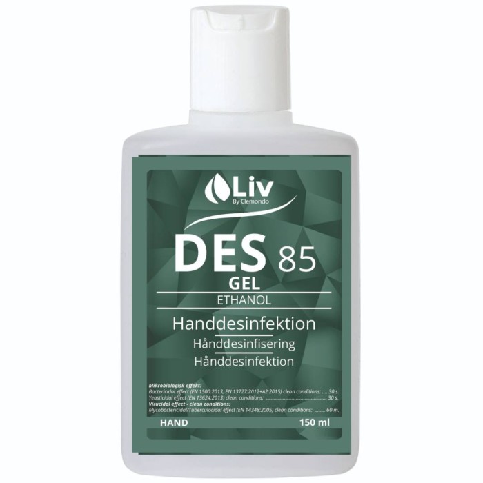 Liv DES 85 GEL är en handdesinfektion i gelform som är återfuktande och lätt att använda för att förebygga och förhindra smittspridning via händerna. Liv DES GEL 85 är effektiv mot olika bakterier, svamp och höljeförsedda virus som t.ex. covid-19 samt murine norovirus (vinterkräksjuka). Liv DES GEL 85 har en alkoholhalt på ca 85 volymprocent. Innehåller glycerin som är en mjukgörare för att förhindra uttorkning av huden. pH-värde 7. Tillverkad i Sverige.
